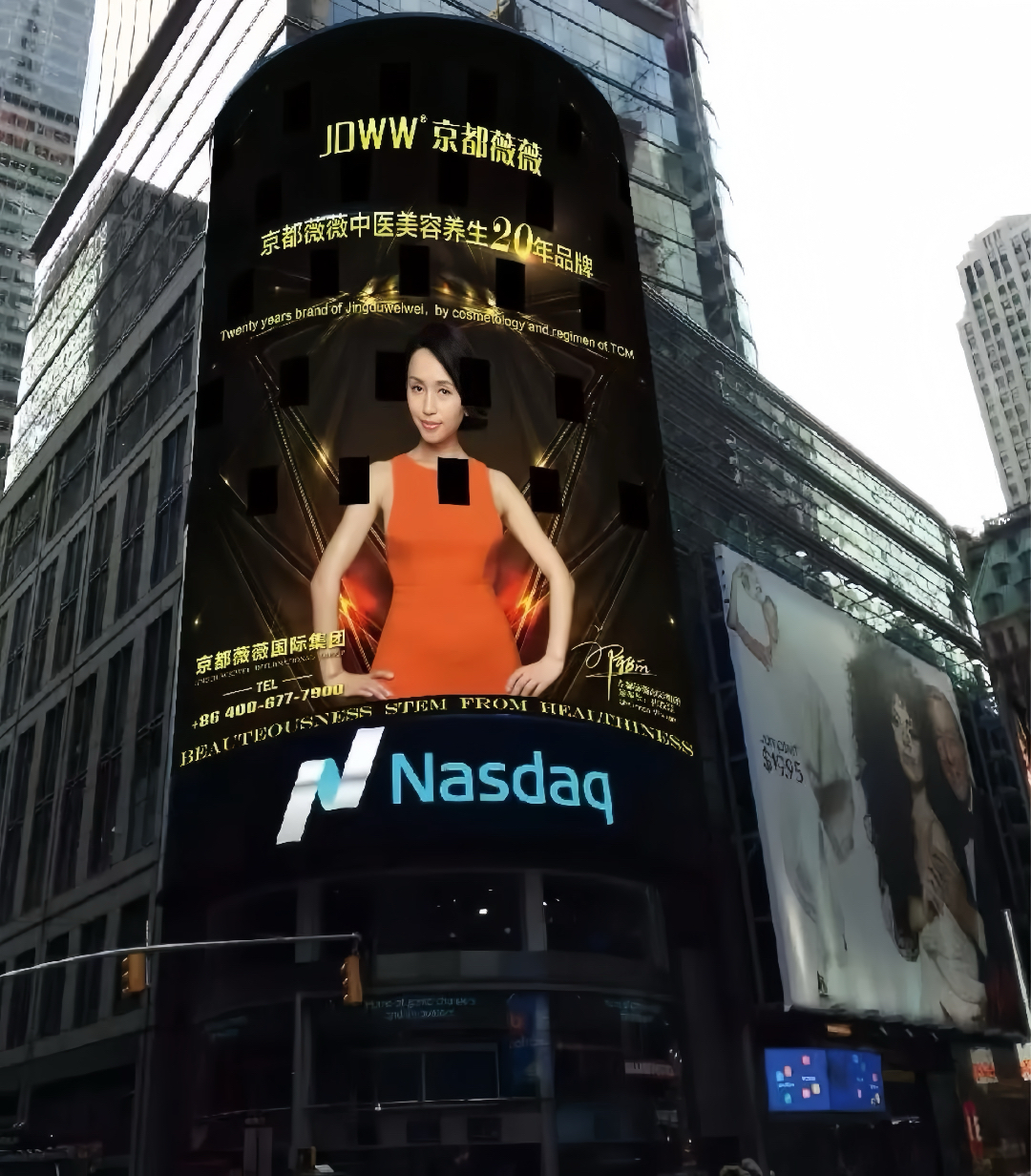 早在2017年,京都薇薇便成功登陆美国纳斯达克第一大屏,成为当时少数亮相纽约时代广场的中国美业品牌。这一事件极大提升了品牌的全球知名度,也为后续的国际化战略奠定了基础。