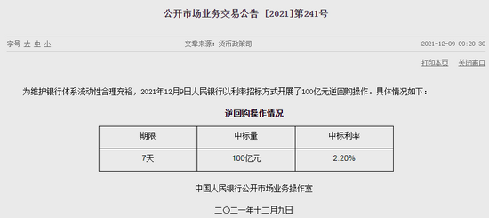 2021年12月9日,中国央行今日开展100亿元逆回购操作,因今日有100亿元逆回购到期,当日实现零投放零回笼。